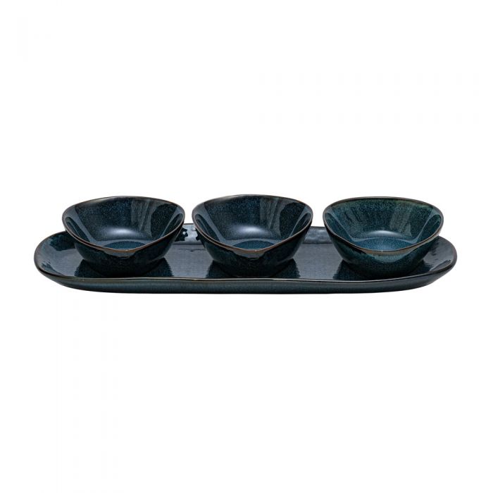 L’antipastiera 4 pezzi della linea Saturno Blu è composta da un vassoio che misura cm. 31x9,5 e da tre ciotole. E’ realizzata in stoneware e la sua finitura si ispira alla natura e alle sue sfumature.