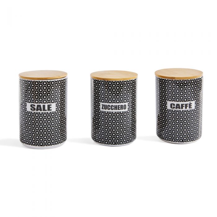 Il set barattoli della linea Diamante è composto da 3 barattoli Sale, Zucchero e Caffè di cm. 10x15. Sono realizzati in porcellana con tappi in legno e decorati con motivi geometrici bianchi e neri che gli conferiscono un design moderno e di tendenza.